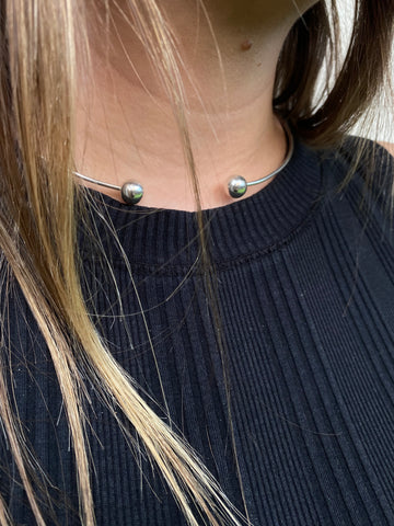 Gargantilla de plata con dos esferas pulidas que aportan equilibrio y brillo. Un clásico que ahora cobra más protagonismo que nunca.
